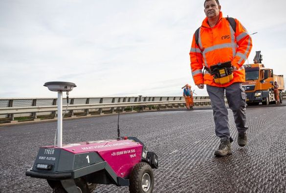 Der Robot Plotter ist ein kompaktes, autonomes Gerät, das Schweiß- und / oder Steuerleitungen auf Asphalt schnell und genau einstellt. Diese Linien werden auf die Straße gesprüht, um anzuzeigen, wo sich die Schweißnaht befindet und wie die Maschine lenken soll. Die Markierung wird dann auf den neuen Asphalt gelegt. Die erweiterte Steuerung des Roboterplotters verwendet eine digitale Zeichnung mit den erforderlichen Linien und wird über GPS oder eine Totalstation gesteuert. „Durch die Verwendung dieses Geräts sparen wir nicht nur Arbeitsstunden, sondern sind auch flexibler und schneller zu bedienen“, sagt Rijk Wandel, Projektmanager Vermessung bei RPS, an der A15 in Ridderkerk.